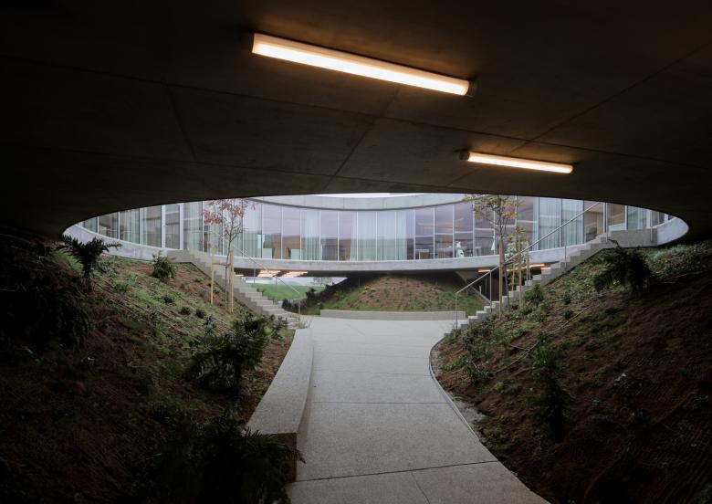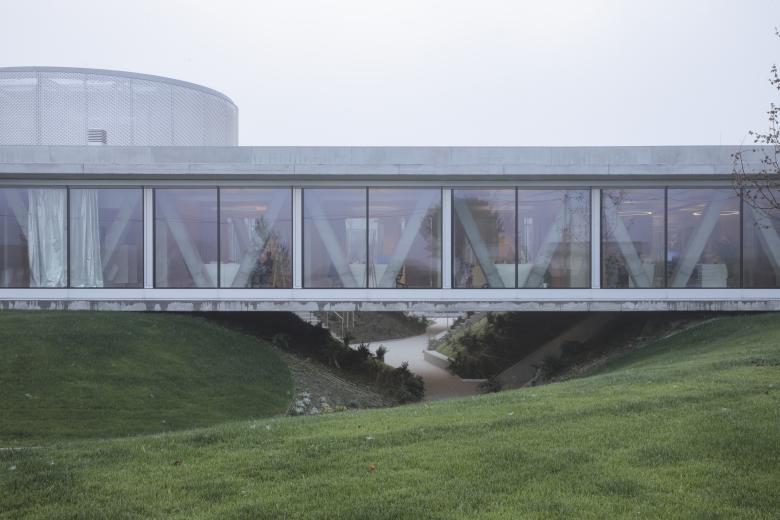The building in Dubrovčan is based on a simple yet powerful concept: a single-story office structure with a square floor plan and a circular atrium, set on three landscaped mounds. As a response to the rapid changes in its immediate surroundings, the building establishes its own context by drawing the natural environment into its interior and inviting gradual spatial discovery.