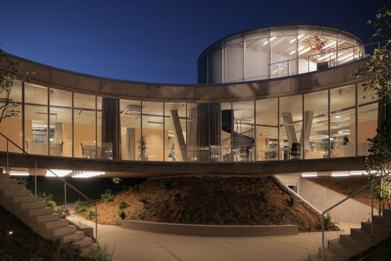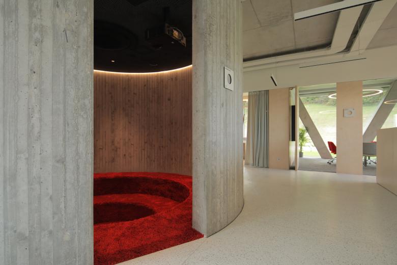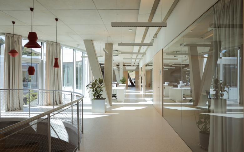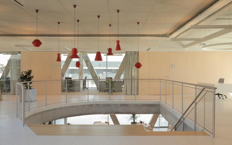 The horizontal organization of workspaces around the central atrium is non-hierarchical, offering different types of work environments—from individual offices and meeting rooms, to niches for teamwork and open hot-desk areas. This inner working landscape is complemented by a small circular hall, an auditorium, a canteen, and a rooftop pavilion with a terrace and running track.