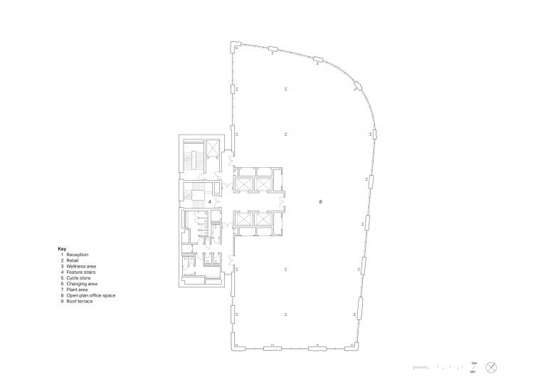 Eden was developed on a former derelict surface car park and is bounded by a 10-story NCP car park to the west, plus the busy intersection of Irwell Street and Trinity Way on the northeast corner. The building’s massing was designed to maximize the internal office space over a small building footprint. The extruded side core facilitates large open-plan floor plates from levels 1–11, with uninterrupted internal views, while the rounded northeast corner mirrors the curvature of the Irwell Street gateway, addressing the geometry of this primary route and anchoring Eden as a city marker for this key junction. The ground floor is set back by two meters, creating a pedestrian-friendly colonnade space and reducing the building massing at the public level. The development has triggered important traffic-calming measures for Irwell Street, reducing the carriageways to accommodate better cycling infrastructure and give more prominence to pedestrians.