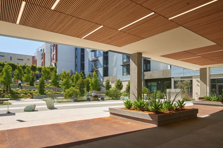 Edwin M. Lee Apartments is the first combined homeless veteran and low-income family development in San Francisco, and has established a new definition for integrated, equitable, and resilient living. The design balances a civic scale with a feeling of home, responding to the Third Street corridor with a colorful serrated rainscreen facade, while offering an oasis-like restorative landscape within. The dramatic solar canopy that cascades to the south entrance is a proud demonstration of low-carbon design.