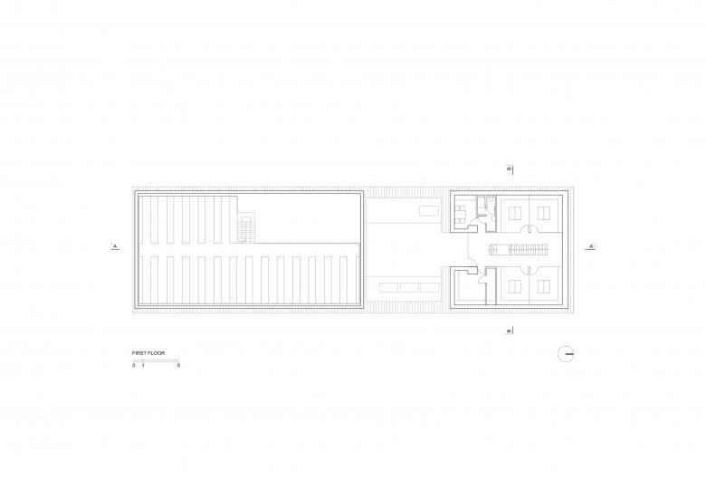 The functional program was strict, but it made sense—a clearly laid-out system of office, warehouse, and utility spaces. Everything had to be as practical as possible, without compromising spatial quality. That is why the offices are on the ground floor—meant for continuous human use—with classic glazing and views onto a small green garden carved out of the parking area. The utility and storage spaces are upstairs, where full-height, usable walls are needed. Those areas are lit from above using skylights.
