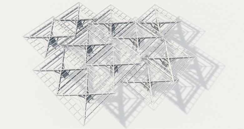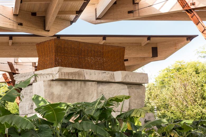 Each pod consists of 63 individual glulam Southern Pine wood beams by Glue-Lam Erectors, ranging from 83 feet long and 19,000 pounds to just three feet and 25 pounds. Translucent roofing materials (U-Lite Monolithic polycarbonate standing seam panels by CPI Daylighting) allow sunlight to filter through to the ground below, and the entire "forest" of pods is held together with 6,424 bolts and lag screws. Beneath the 35-foot canopy, a hearth of rough-back quarry block Indiana Oolitic limestone serves as a visual centerpiece and will provide warmth during colder weather.