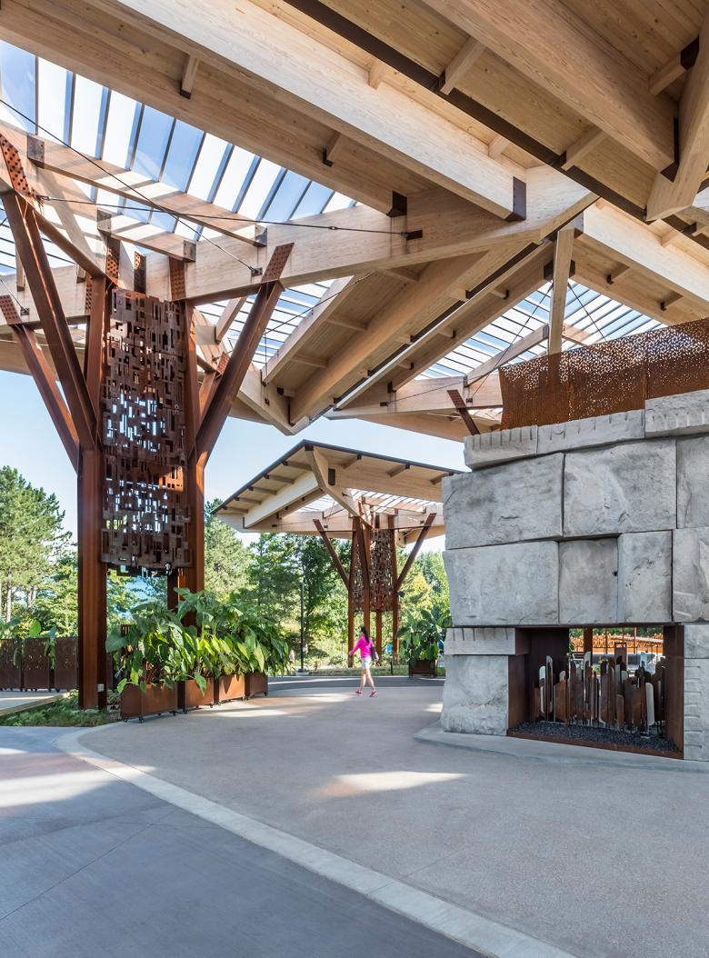 The solution was to create an open-air special events facility that is protected from the weather and able to support a wide variety of sometimes-simultaneous group activities, including concerts, picnics, and private events, while also expanding on existing shoulder season events such as Christmas at the Zoo in December and ZooBoo in October. (Previously, this purpose was fulfilled by a semi-permanent 400-person tent located next to back-of-house areas near the Zoo’s main entrance.) Importantly, this new facility would have to be compelling enough to be an attraction of its own, but "quiet" enough to be transformed for events and programming.