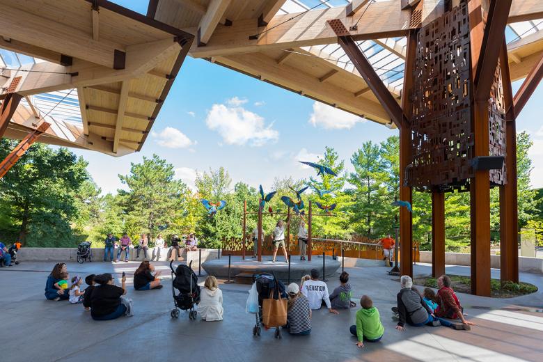 The resulting Bicentennial Pavilion and Promenade is modeled after a lush rain forest and crafted primarily from natural materials. The Pavilion’s eleven steel tree-like "pods" provide 40,000 square feet of weather-protected space and a unique, high-drama environment for up to 1,000 seated event attendees. The forest-like environment also provides a unique location for the Zoo’s newest bird exhibition, Magnificent Macaws, with a custom-designed stage and perch that showcases the birds on their twice-daily flight through the Pavilion.