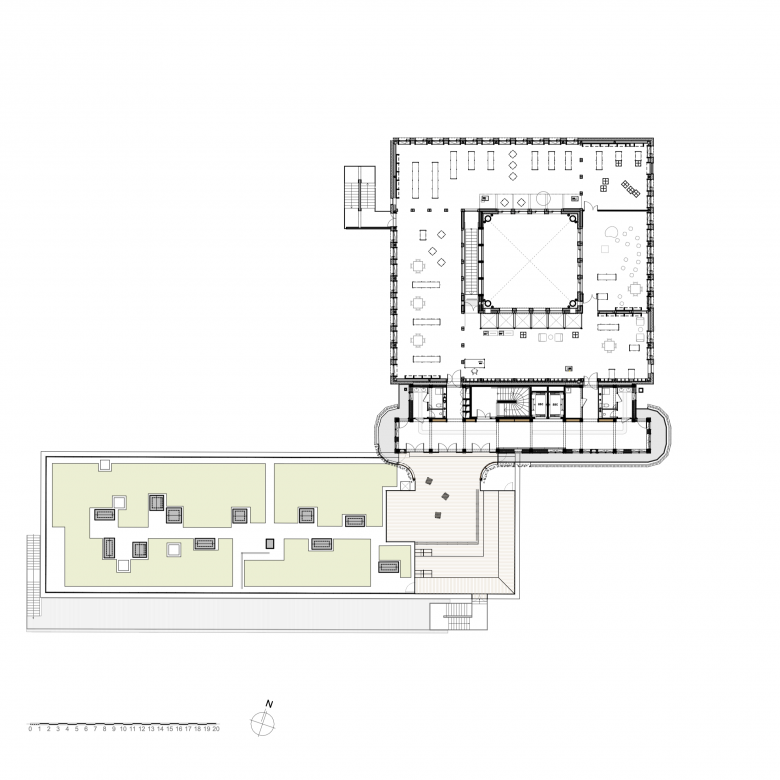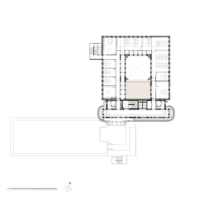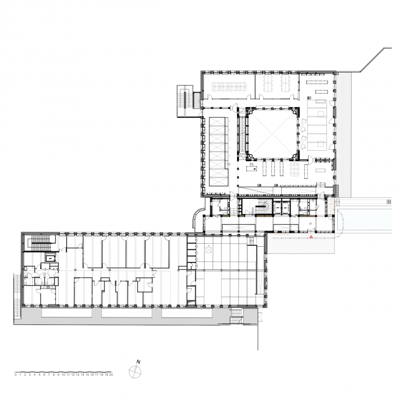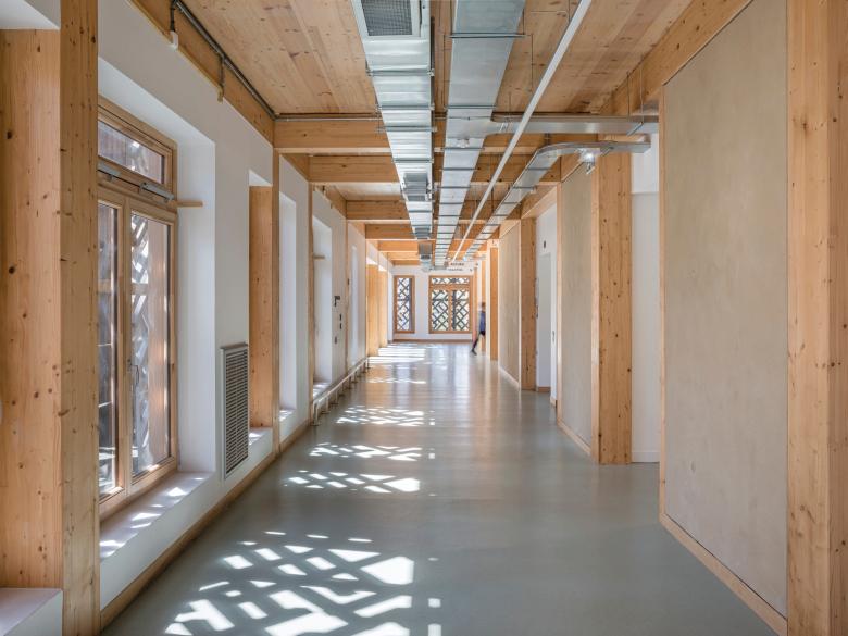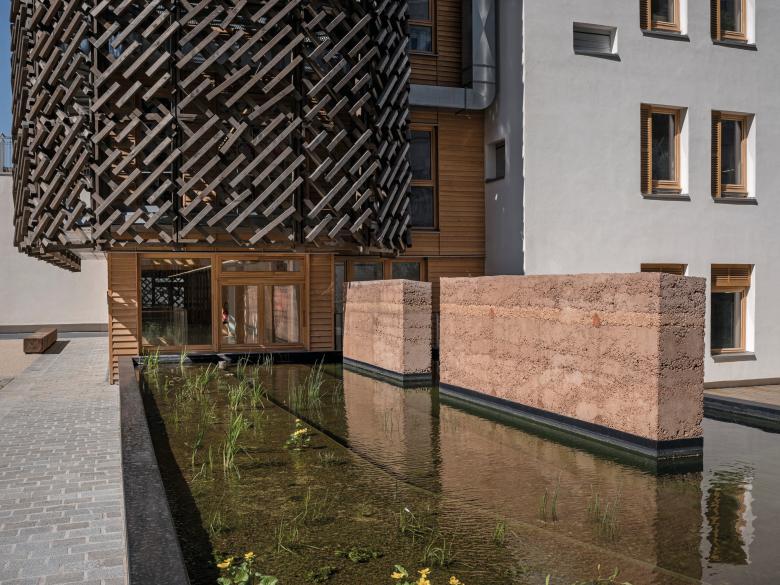 Taking an ecologically responsible approach, the architects have achieved a thorough renovation of the existing situation with a new construction made of biosourced and “geoscourced” material. The buildings, the square media library and elongated refugee house, are joined by a vertical volume, called “the link,” which serves the different levels and spaces of these two establishments. The walls of this unheated wooden construction are made of prefabricated poured earth, guaranteeing thermal inertia and regulated humidity. A wooden mantilla envelops the link whilst also serving as a high-protection sun filter.