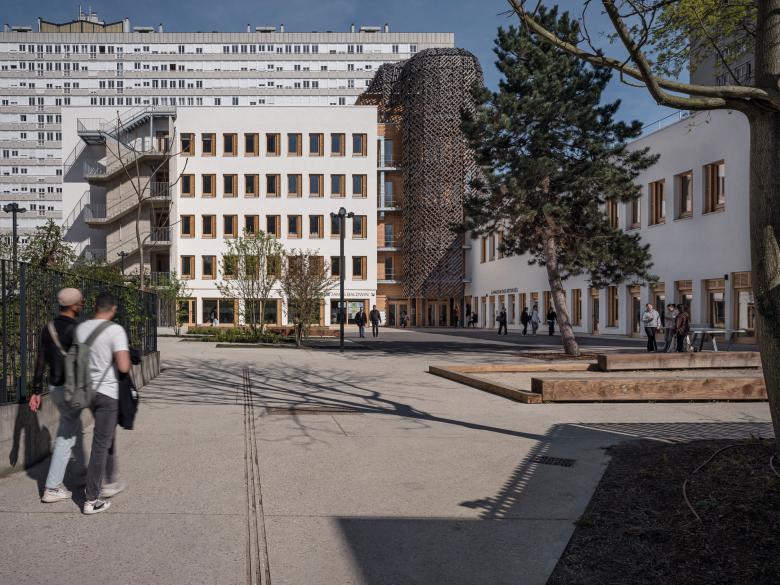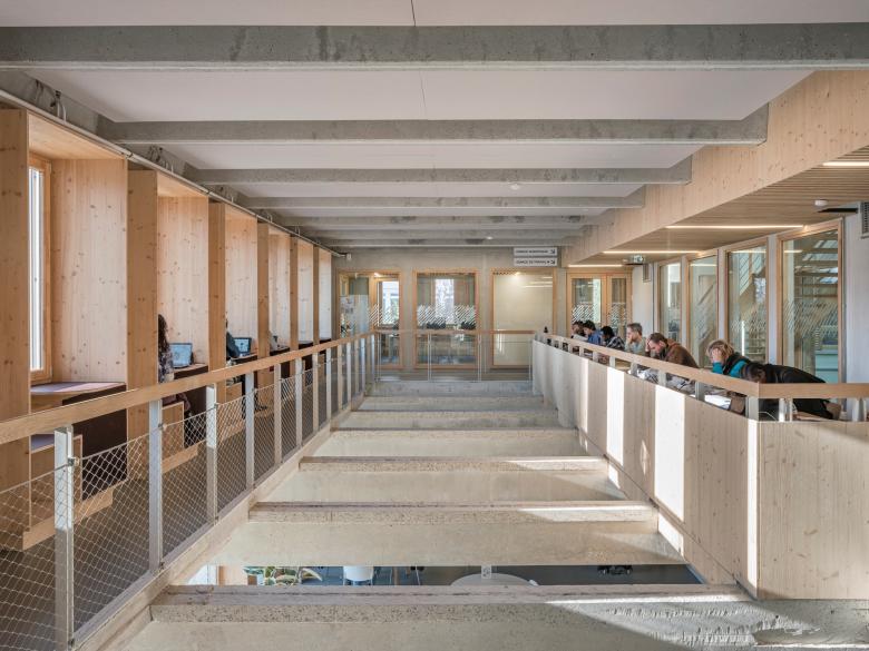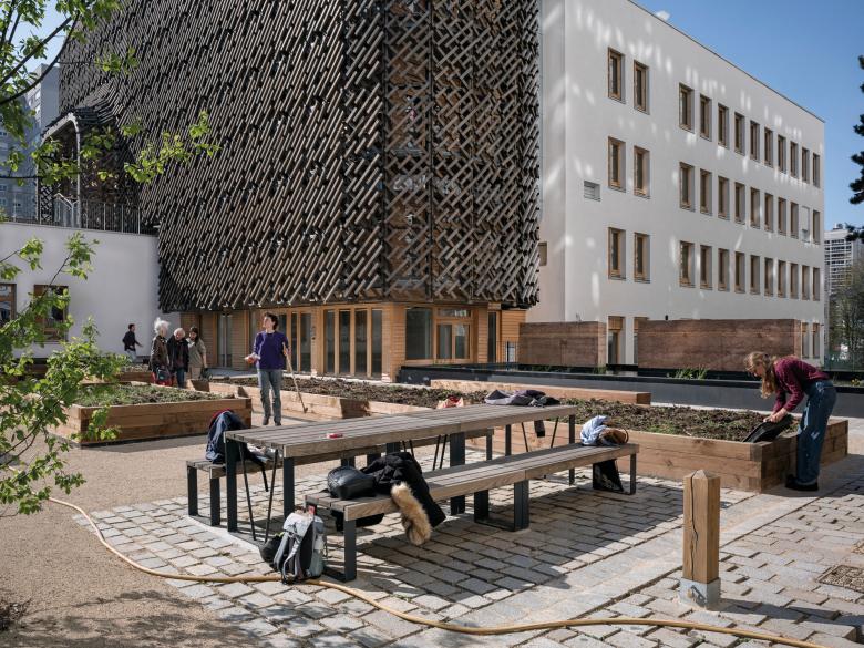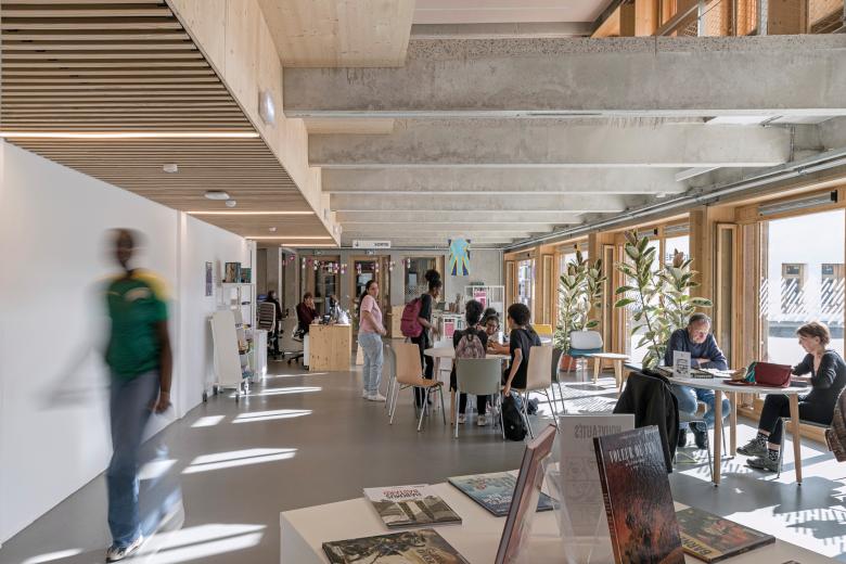 The tall post and beam structure provides a welcoming space for refugees and residents to enjoy beverages, learn French, and cook. It features spacious areas and diverse places with specially designed acoustics for everyone's comfort. A long terrace facing south offers relaxation moments and access to a shared garden.