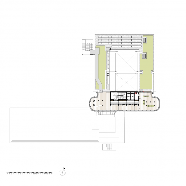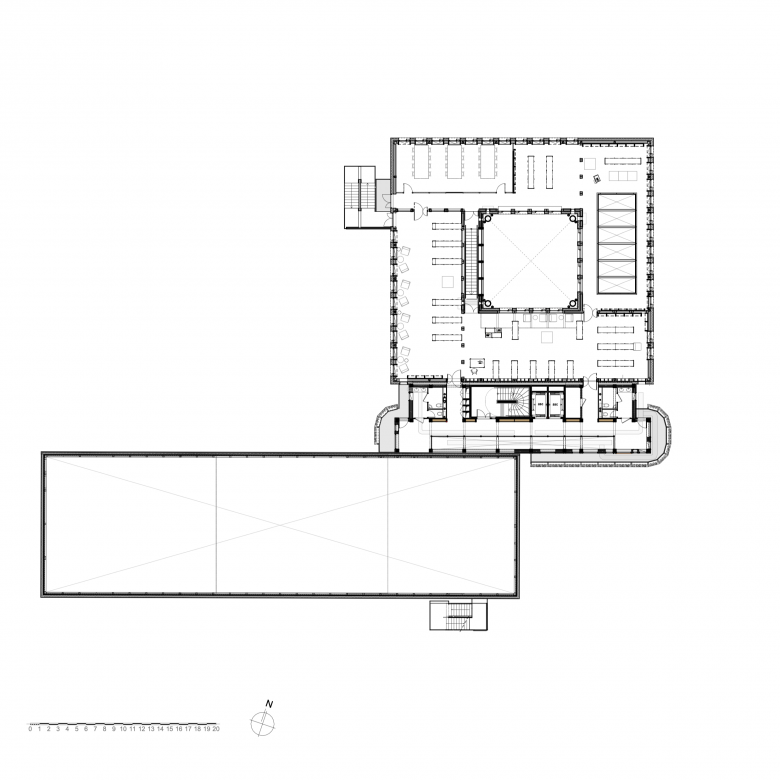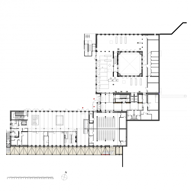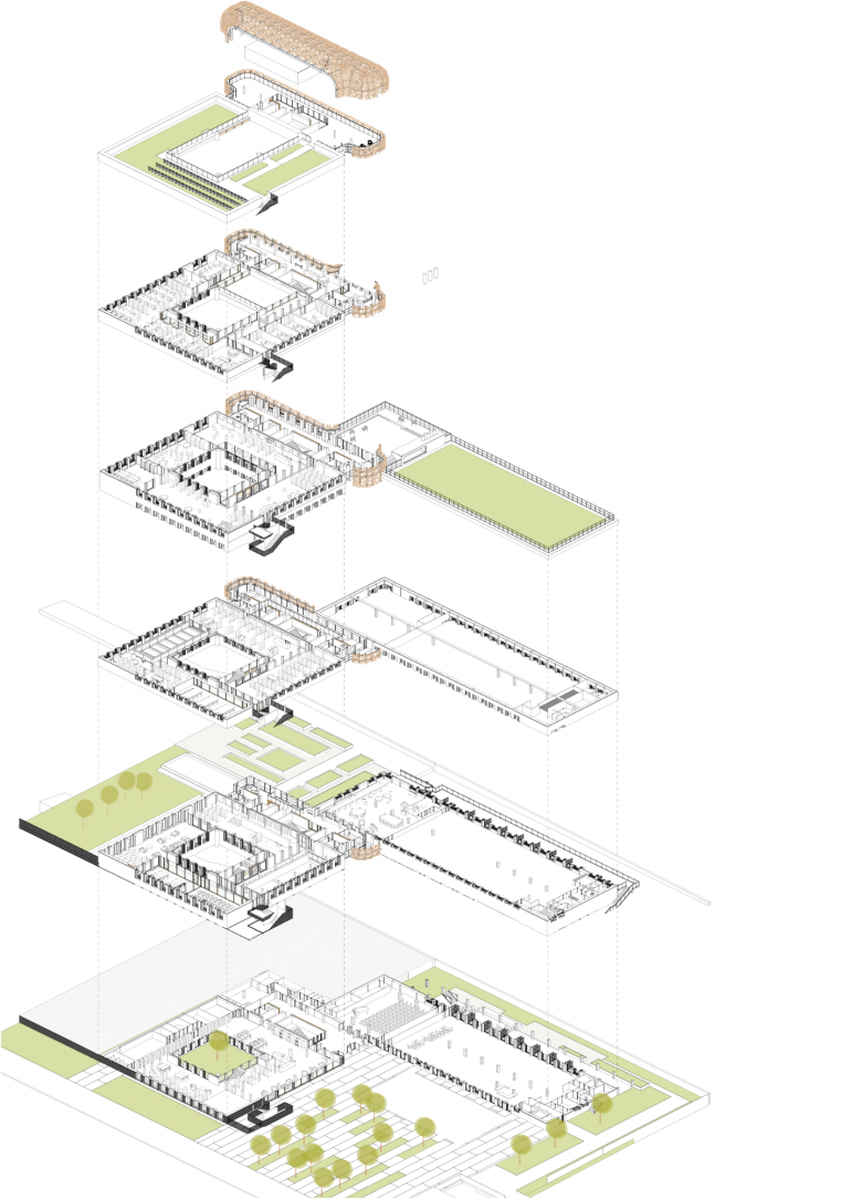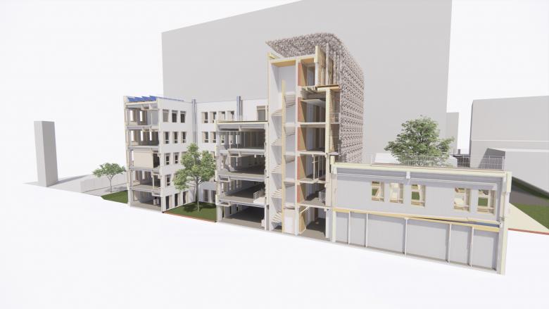 The former secondary school structures have been preserved, cleaned, and had asbestos removed. Prefabricated elements like reinforced concrete posts, beams, floors, and façade panels were refurbished. A selective deconstruction of concrete floors, walls, and façade panels was conducted, with cut-off pieces kept on-site for reuse. This process restored the structure's regularity and improved the quality of the exposed reinforced concrete. As a result, ideal spaces for a media library and welcome center have been created.
