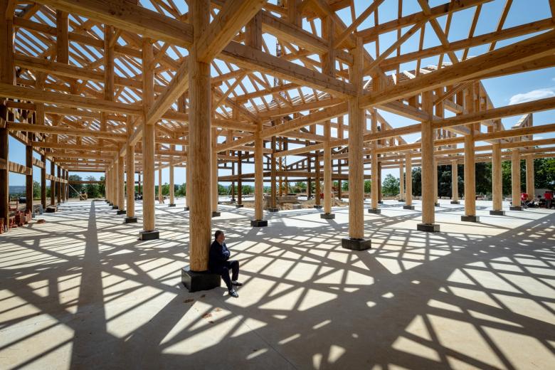 Yes, exactly—100 points for the concrete foundations for the columns. There’s a cement floor, and local stone for the flooring. The round bases of the columns are made from locally sourced stone that is machine-cut and very smooth. We also used local Douglas pine wood, local bricks and local tiles. The only reason for using all the local materials was that it was cost-effective.