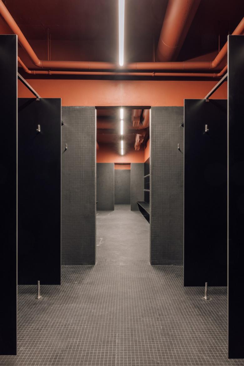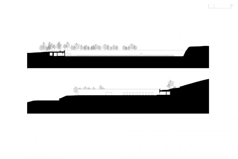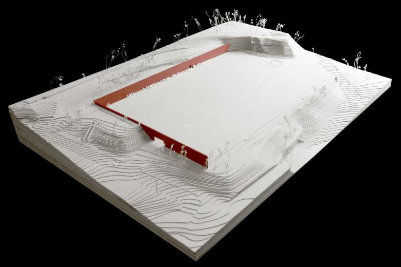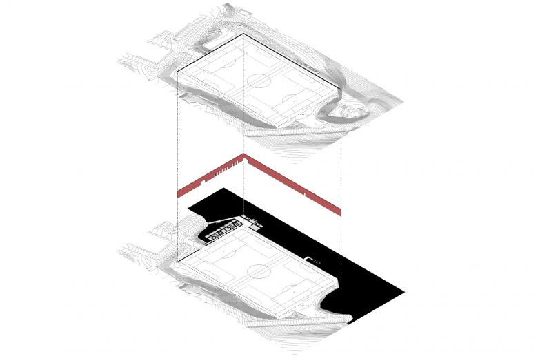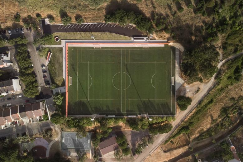 The entrance is made by a ramp that cuts into the hill and gently descends to a covered atrium at pitch level, giving access to a continuous bench. There are no spectators in second row. On the upper level, the new plateau offers an informal view of the field, functioning as a public viewpoint.