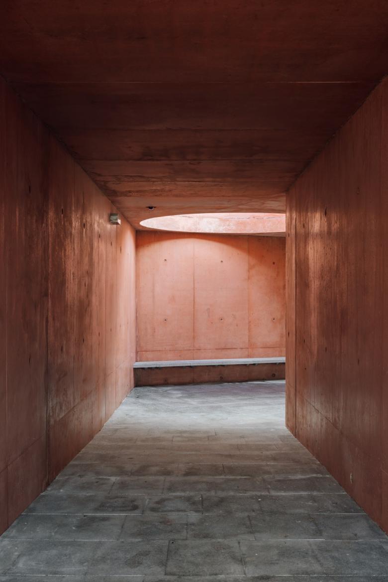 Built in reinforced concrete with iron oxide pigment incorporated into its composition, the retaining wall merges with the rocky outcrop, which also becomes a central element of the design. This blurs the boundaries between architecture, structure, landscape, and the natural terrain itself.
