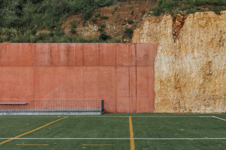 The project for the Laje Football Field is, in short, a retaining wall. A precise "L"-shaped wall that defines and enables a flat football pitch on a steep slope, creating an arcade that gives access to the support facilities located underground.