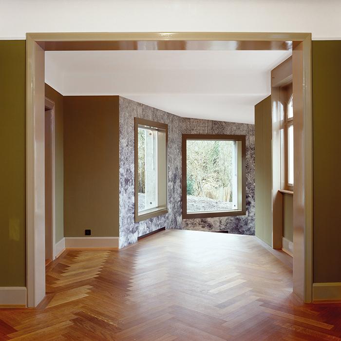 All-encompassing wallpaper with a botanical pattern merges with the real views of nature. This traditional bourgeois motif refers to the turn-of-the-century atmosphere found in the residence: the darkening of the space emphasizes the light romantic garden. On the one hand, the thin aluminium frames of the large windows, which completely slide into the wall, suggest a modernist gazebo celebrating an open relationship between inside and outside. On the other hand, the clear opening cut inside the wall, a window, turning it into a classic garden pavilion.