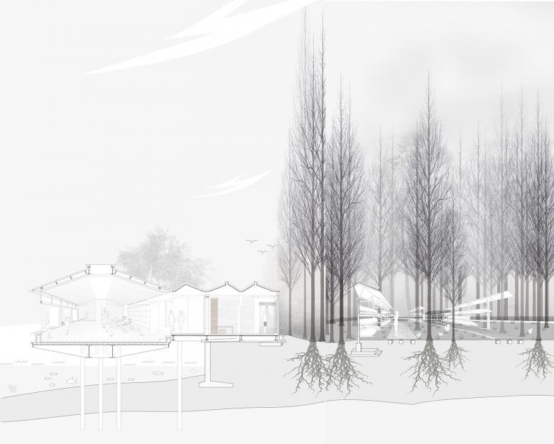 The dynamic, wedge-shaped composition made up of the aforementioned elements protrudes into the river bend. On the land side, the various components remain largely hidden behind the trees. The additional boat storage shelves are also placed between the trees and since these structures only have a roof covering and no walls, they appear to almost disappear into the surrounding nature. Towards the water, a flat wooden ramp connects the boat moorings with the pier.