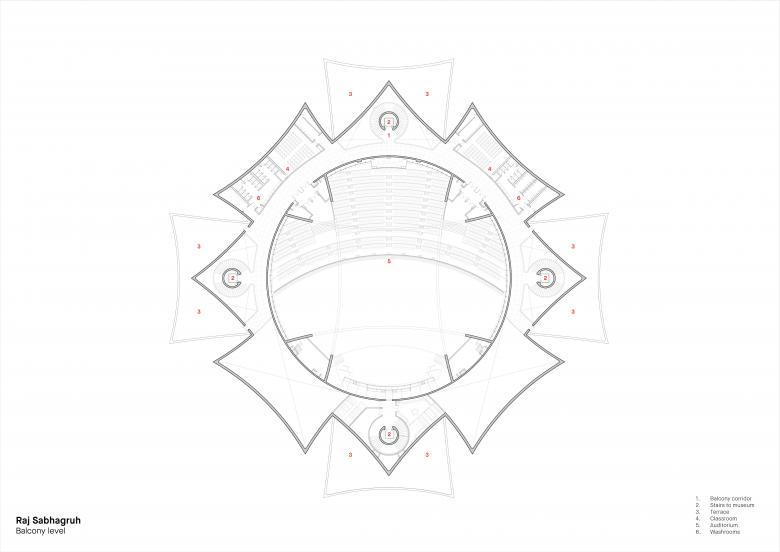 An array of concentric, timber, acoustic baffles radiate outward from the centre of the drum ceiling, recalling the radial patterns of the intricately carved sky-domes found within the ceilings of the Maha-mandapa, the primary gathering halls of ancient Jain temples. The circular auditorium with the stage for the Guru, placed within its eastern quadrant draws the audience close to him in intimate dialogue and instruction. A suspended balcony provides clear sight lines to the stage while a flat auditorium floor allows for a flexible space where various programs and events can unfold.