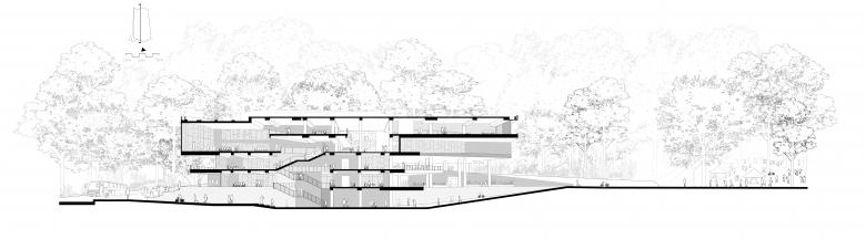 The design takes inspiration from the idea of a tree—anchored yet outward-reaching—and from the campus’s aspiration for a civic plaza. This metaphor informs a form that is grounded at its core while branching into inclusive edges, opening views and routes to invite movement. The democratic ethos of libraries as places of shared knowledge also shaped decisions, favoring spaces that cultivate relationships over formal showmanship. Material clarity and sectional depth reinforce this quiet, connective character.