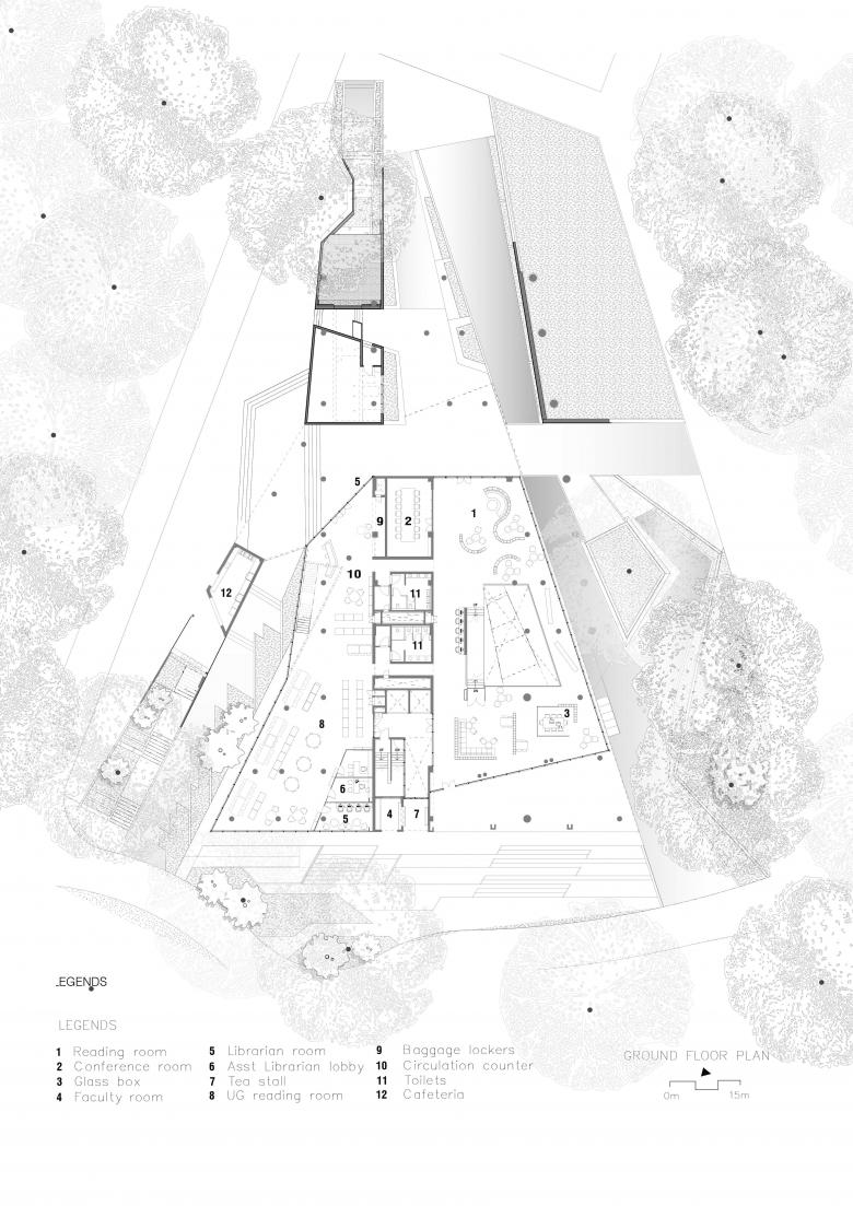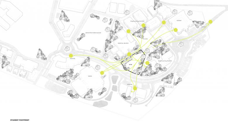 Site forces were decisive: an arterial road bisecting hostels and academics, the adjacency to the planned central plaza, and a significant tree cover. The building negotiates these conditions by folding into the ground, threading between trees, and admitting pedestrian desire lines through its body. Its edges open to the plaza to act as a spillover civic room, while its massing anchors key crossings to calm and organize movement. In short, the site’s flows and ecologies authored the form.