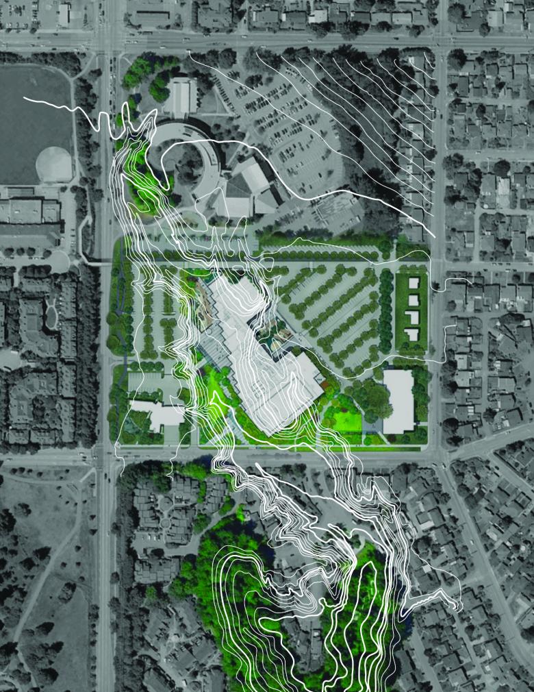 The architectural response reinstates the character of the precolonial landscape. Shifting to a cardinal north/south orientation, the building sits along the natural topographic line of the former headwaters of the Glenbrook Ravine, which was erased by development decades ago. Now, the headwaters have been resurfaced as a major public green space and rain garden, reconnecting them with the remaining branch of the ravine to the south.