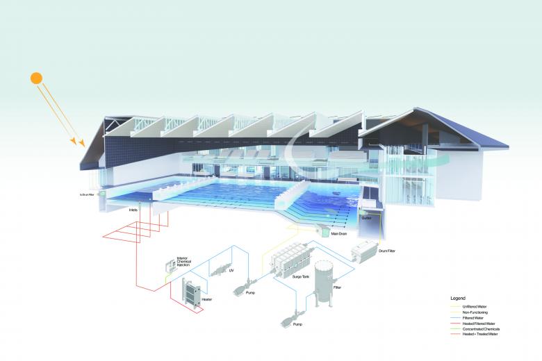 It is also the first facility to use the gravity-fed InBlue filtration system, which reduces the need for chlorine usage and the creation of associated harmful byproducts, resulting in improved air and water quality.