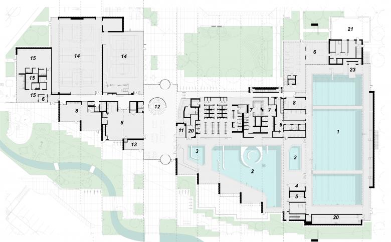 The building grid aligns with this new north-south orientation, allowing for a generous but carefully controlled daylighting approach and enabling a visual permeability through the entire cross section of the building, including the universal change rooms.