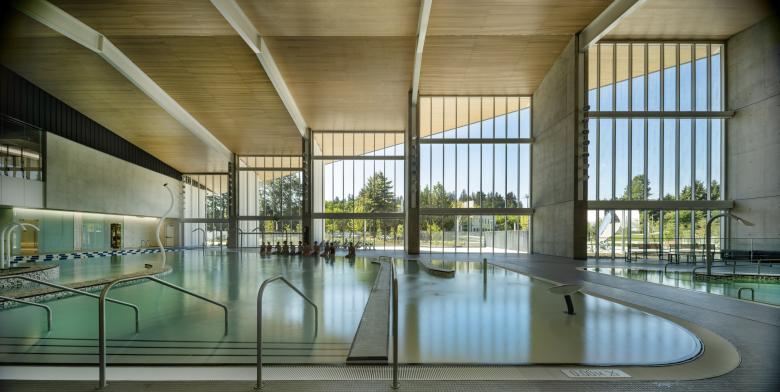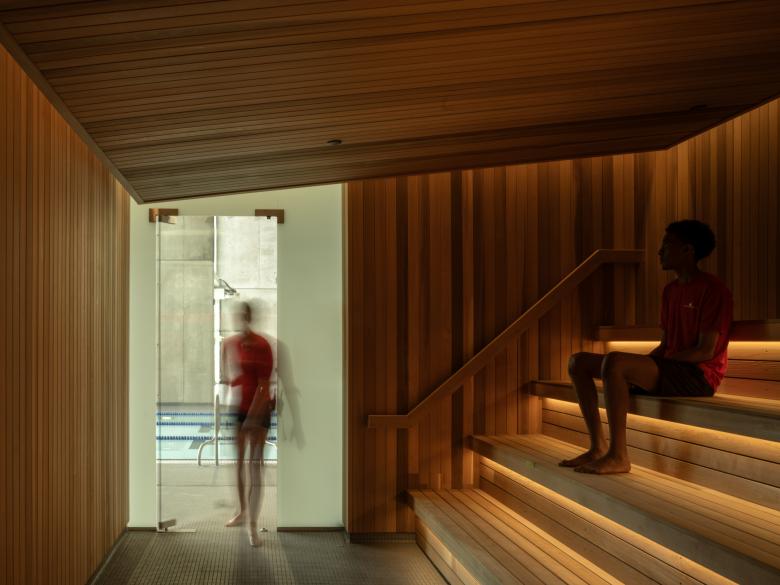 Inclusive design and physical accessibility are core aspects of the facility’s planning and detailing, evidenced by the generosity of circulation space; high contrast signage that includes braille and tactile directories; fully universal washrooms with adult change tables and lift devices; ramps and zero-entry conditions into the leisure and family hot pools; as well as a transfer ledge in the adult hot pool and moveable floor in the 50m pool. The pool change rooms offer options for all-genders as well as dedicated male and female spaces. The facility has achieved Rick Hansen Foundation Accessibility Gold Certification.
