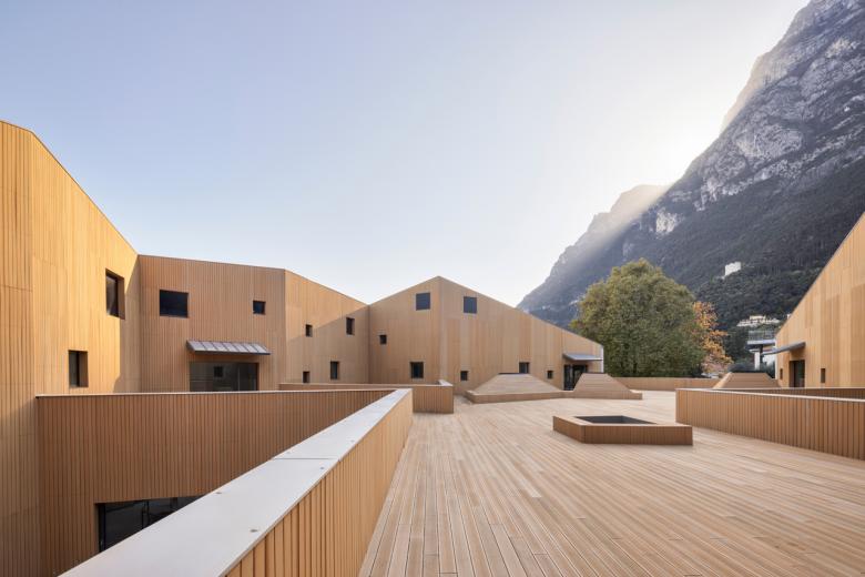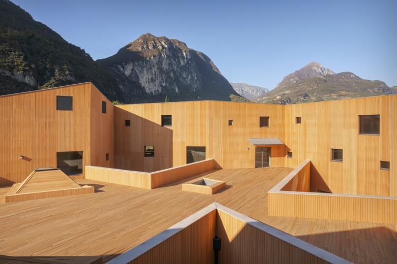 While the exterior blends harmoniously with Riva del Garda’s historic center, the inner courtyard offers a more intimate and welcoming atmosphere, evoking the atmosphere of a small village. The pyramid-shaped skylights emerge as sculptural elements that also serve as outdoor seating along raised flower beds. The irregular roofline appears to echo the silhouette of the mountains in the background, while the inner walls – clad in composite wood slats – feature a series of irregular openings that create a uniform yet dynamic pattern.