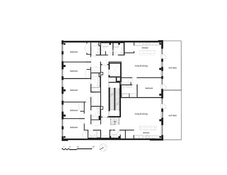 In New York City, the form of the building is to a large extent determined by the allowable zoning envelope and site conditions. Within these constraints, the building takes advantages of views to the west of Manhattan in the distance (a view facilitated by the downward topographical slope) with angled large windows and terraces on the upper floors. On the lower floors, the punched-opening window pattern conforms to the module of other houses on the street. This module, in conjunction with the brick facade, helps the building to engage the existing built fabric of the block even though it is larger and ultimately quite different from these older houses.