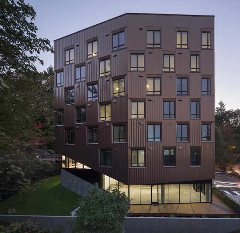 TreeHouse is a new mixed-use apartment building located on a steep and constricted site on the Oregon Health and Sciences University campus. The 7-story building is comprised of retail on the ground floor and 69 apartment living units above. Both retail and apartment units are intended to serve OHSU’s community of faculty, researchers, and students, as well as providing housing opportunities for the approximately 14,000 people who work in the Marquam Hill medical complex.