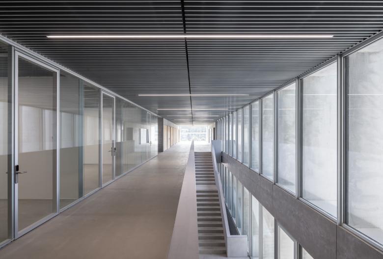 The central atrium forms the heart of the complex, serving as a hub for entrances and connections between the various facilities. Designed as a spacious, open-plan area, it accommodates a variety of uses and encourages interaction among students, faculty, and visitors, reinforcing the building’s public and institutional character.