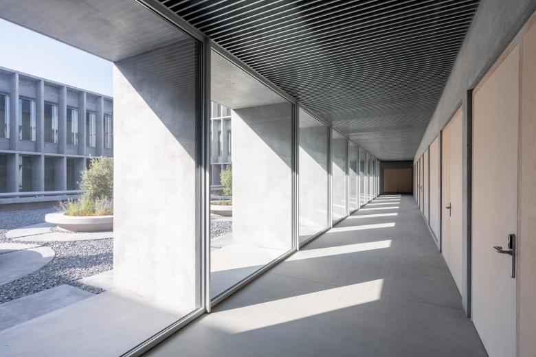 The landscaping and design of the outdoor spaces follow principles of minimal intervention and low water consumption. The landscaping employs xeriscaping (gardens with low water requirements), featuring native plant species and permeable paving that address the scarcity of water resources in the area, integrating the building into the landscape without unnecessary embellishments.