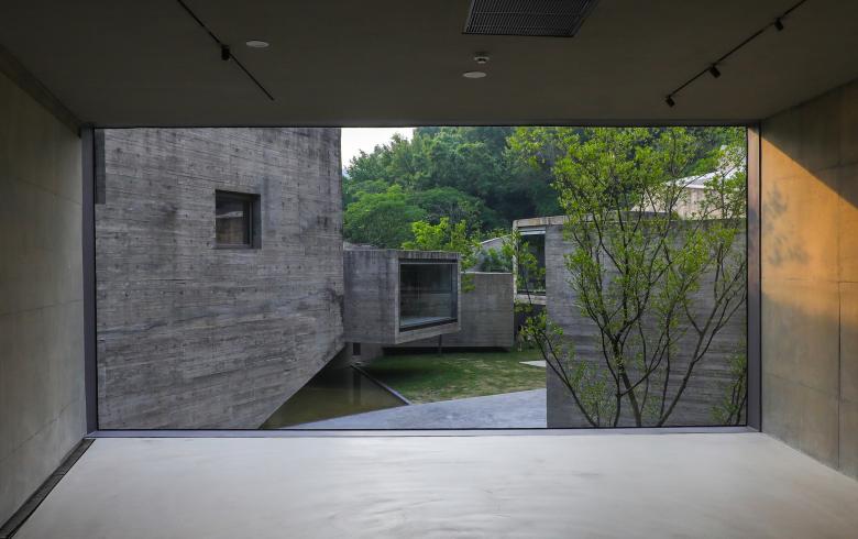 The museum’s unusual shape, nestled into the contours of the terrain, evokes an animal—perhaps a snake—winding itself around a central garden. Inside, visitors follow a looping path, a circular promenade that unfolds along a series of ramps. These ramps bridge over the elevated sculptural structure that marks the museum’s entrance. From the outside, the polygonal building is largely closed, with the external facades punctuated only by a few carefully placed openings. On the inside, box-like volumes project toward the inner courtyard—a contemporary interpretation of the traditional scholar’s garden—and frame deliberate views that subtly integrate the world beyond the museum walls.