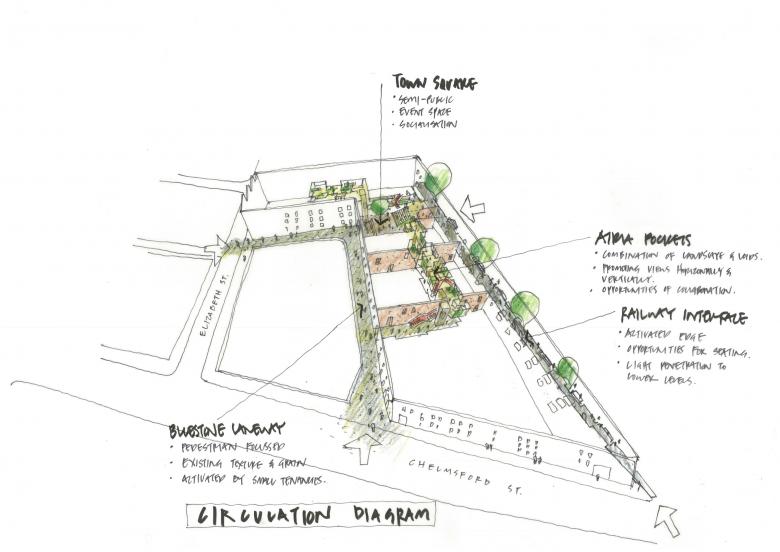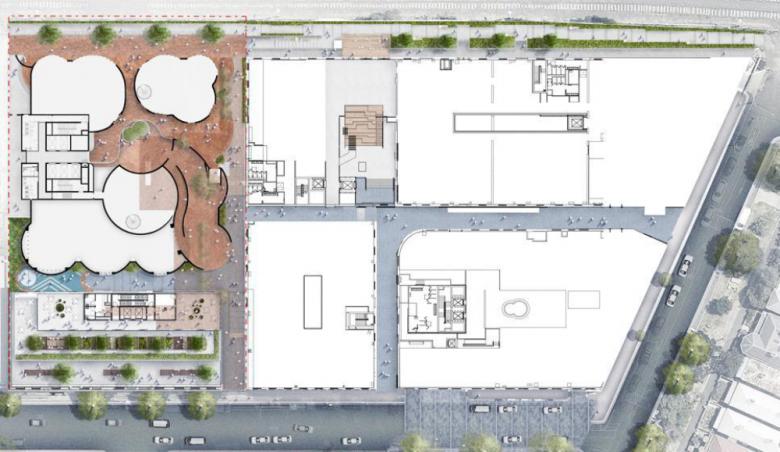 The design prioritizes community benefit through integrating public spaces, pedestrian connectivity, and facilities that support social interaction. Multiple entry points have been carefully curated to provide connections, inviting public and private collaboration. Central to the design was the introduction of a “town square,” strategically located at the heart of the precinct, offering light-filled auditorium seating—a space for people to meet, share, socialize, and connect. The town square connects to the new activated rail corridor, a landscaped shared pedestrian and bicycle pathway.