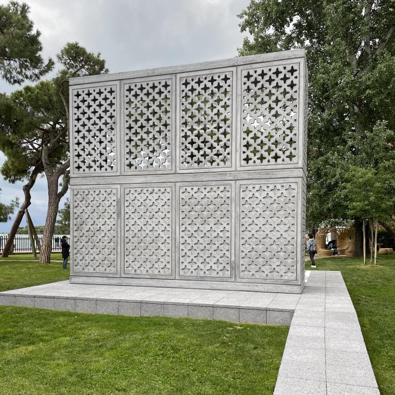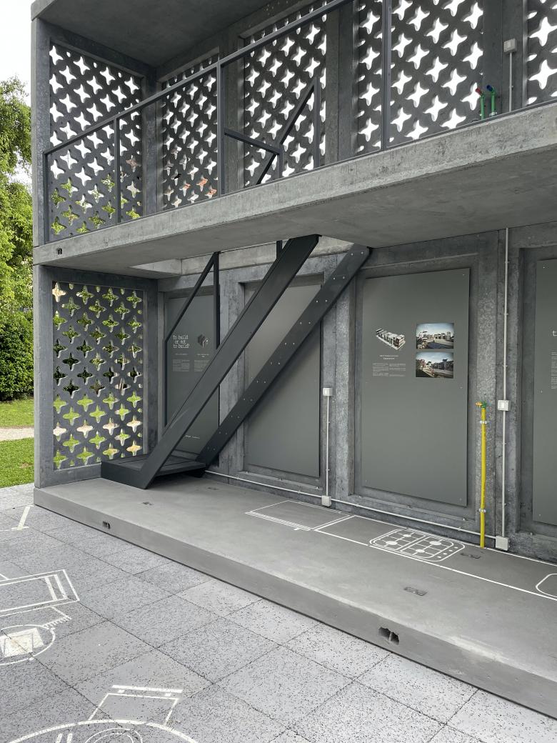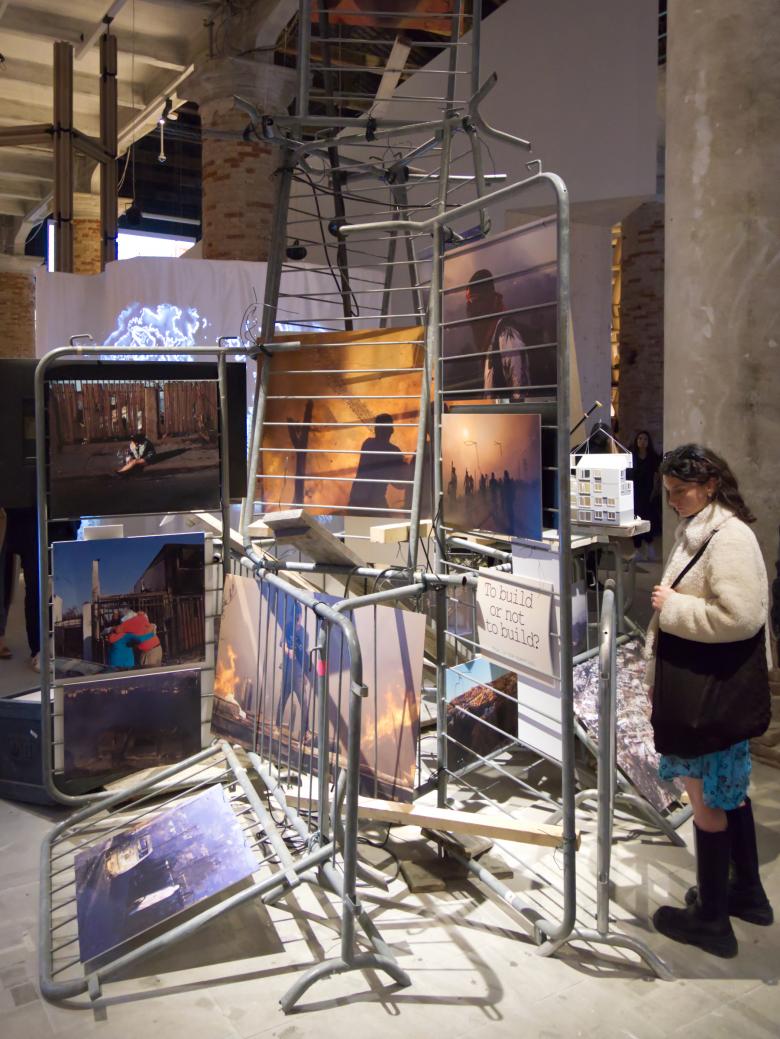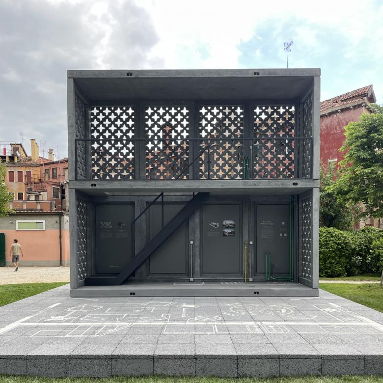 The three pieces are united by one question: “To build or not to build?” It is spelled out in the Arsenale's Corderie building, on a sign embedded within a carefully balanced construction made from crowd control barriers (image above), while a more traditional exhibit at ECC's Palazzo Mora explicitly asks the same question with its wall text. Elsewhere, at Giardini della Marinaressa, the question is implied in a full-size variation of one of ELEMENTAL's Basic Services Units (USB)—aka incremental housing, in which dwellings are half-built and residents complete them over time based on their needs, budget, abilities, and other factors. The prototype in the garden stands out for its patterned, porous concrete walls: