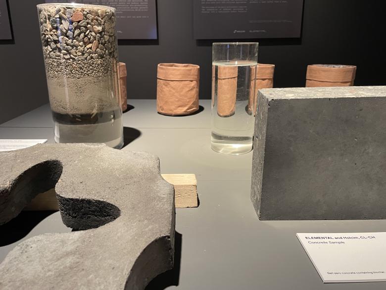 The display also has a table with the materials that go into the Biochar panels. (Photo: John Hill/World-Architects)