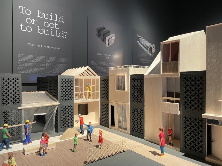ELEMENTAL and Holcim's room at the Time Space Existence exhibition at Palazzo Mora consists of models showing Aravena's incremental housing built with the Biochar panels: