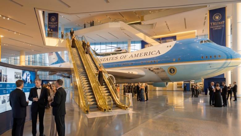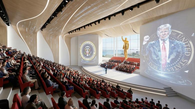 Other spaces shown in the video include a trio of White House recreations: the so-called Presidential Walk of Fame, installed in a hallway opposite a video wall depicting what appears to be the Rose Garden before Trump's recent renovation; a recreation of the planned East Wing ballroom, visible behind an angled glass wall; and a recreation of the Oval Office. Although this last piece is typical of presidential libraries, the rest is decidedly atypical—in line with Trump's two terms as president. Curiously, this week's teaser video comes just 14 months into his second term, much earlier than previous presidents. Barack Obama, for instance, didn't reveal designs for his presidential library and museum until May 2017—four months after he left office. This week's reveal of the Trump Presidential Library and Museum comes three months ahead of the opening of the Obama Presidential Center in Chicago on June 19th.