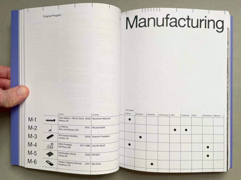 Although Wong defines and describes numerous host structure types (entity, shell, semi-ruin, fragmented, relic, group) and then illustrates projects that fit them, Extending the Lives of Buildings is not a survey that architects or architecture students can mine for inspiration. While certain projects recur throughout the book as seminal examples of adaptive reuse (e.g., Michelangelo's Santa Maria degli Angeli e dei Martiri, Sverre Fehn's Hedmark Museum, David Chipperfield's Neues Museum, Peter Zumthor's Kolumba, etc.), readers must venture elsewhere for additional illustrations and information on these and other projects of interest … or delve into Adaptive Reuse in Architecture: A Typological Index. Published by Birkhäuser in 2023, this second book by Lilian Wong finds much overlap with Extending the Lives of Buildings but takes a more methodical approach to the subject and the documentation of precedents within. The book uses graphs, lists, texts, and brief case studies of notable projects to focus on a half-dozen typologies that have become hosts in transformations to other uses by guests over the last half-century.