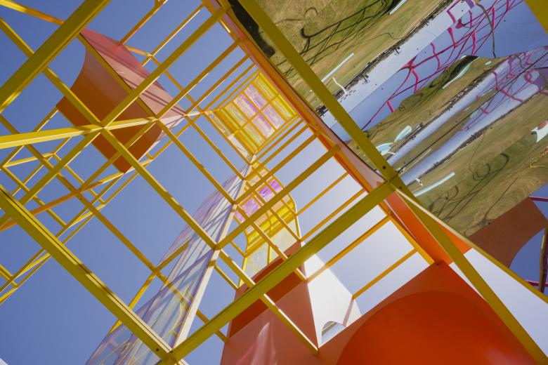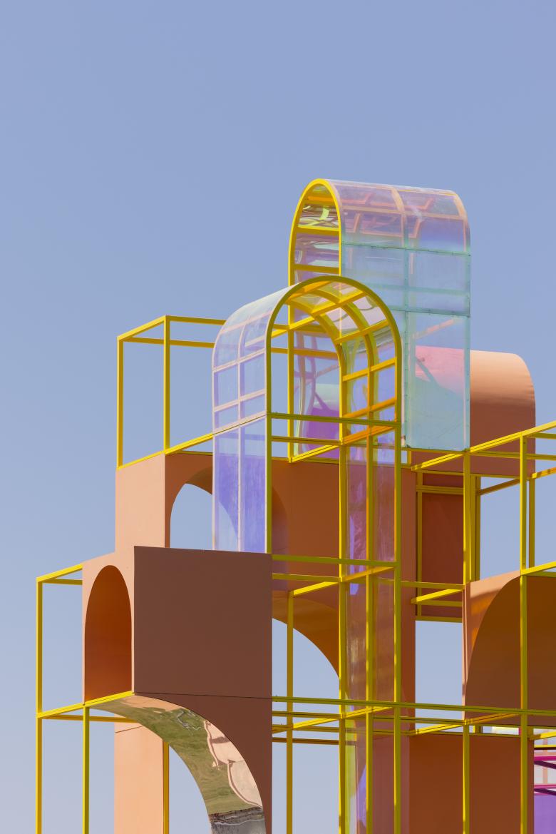There must be something about Southern California's Coachella Valley that inspires artists and designers to tap into every color of the rainbow: in 2019, the last time the festival was held, the standout contribution was Francis Kéré's Sarbalé Ke, a dozen towers in triangles of color. Architension's The Playground continues that "tradition," as explored below in a few photographs.