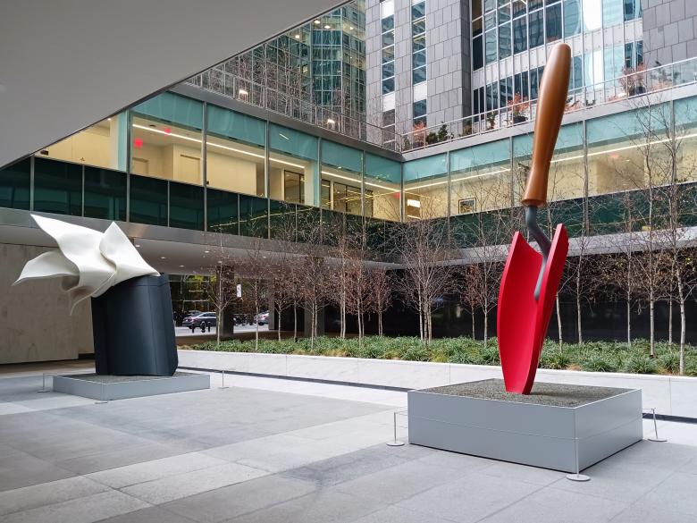 As presented by Brookfield Properties and WatermanClark, in conjunction with Paula Cooper Gallery, Claes Oldenburg & Coosje van Bruggen at Lever House is “the first significant presentation of the artists’ work since Oldenburg’s death in 2022.” In addition to Architect’s Handkerchief from 1999 and the more recent Plantoir, Red (Mid-Scale), done between 2001 and 2021, the year-long exhibition that opened last November includes sculptures, posters, and sketches in Lever House's lobby. One of the first glass-walled International Style office buildings in the United States, Lever House was designed by Skidmore, Owings & Merril in 1952 for Unilever. It was recently restored by SOM for Brookfield and WatermanClark, who took possession of the building in 2020. Based on the current exhibition and the Ellsworth Kelly sculptures on display in the plaza and lobby at the time of our visit in 2023, it seems the new owners are striving to make the ground floor of the modern masterpiece a Midtown destination for art aficionados.