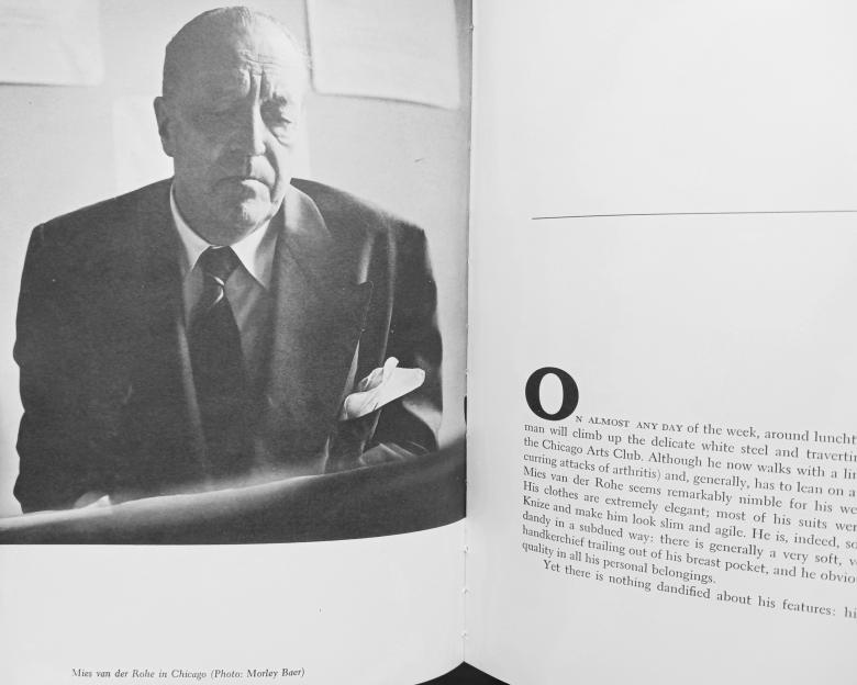 Photo of Mies by Morley Baer in Peter Blake's The Master Builders: Le Corbusier, Mies van der Rohe, Frank Lloyd Wright (Alfred A. Knopf, 1960) (Photo: John Hill/World-Architects)