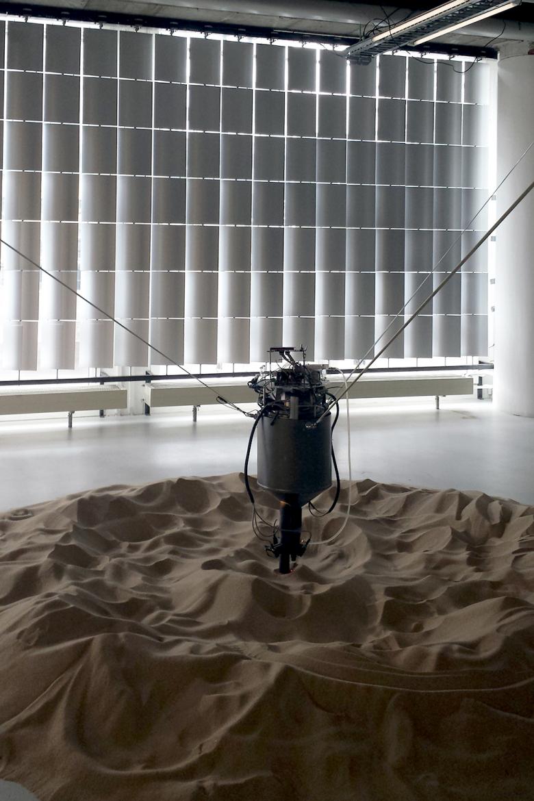 At the other end of the spectrum from the huge – and hugely popular – Swiss National Museum is the tiny MuDA, located in a 400-sm storefront space in the Herdern Hochhaus, a landmarked tower in Zürich West. MuDA bills itself as "Europe's first physical and virtual museum dedicated to digital arts," and its current exhibition, on Gramazio Kohler, is the museum's first to focus on architects. Of course, Fabio Gramazio and Matthias Kohler are not your typical architects, with their ongoing research and projects incorporating robots and other atypical means of production. Although only five sections in total, two of those are new pieces built specifically for the exhibition: a cable robot with vacuum that randomly sucks up and spits out sand (photo above) and a pair of robots that alternately hold a piece of foam suspended in the air solely through the use of sound waves (video is below, but seeing it in person is better). Gramazio Kohler is on display at MuDA until 16 July.