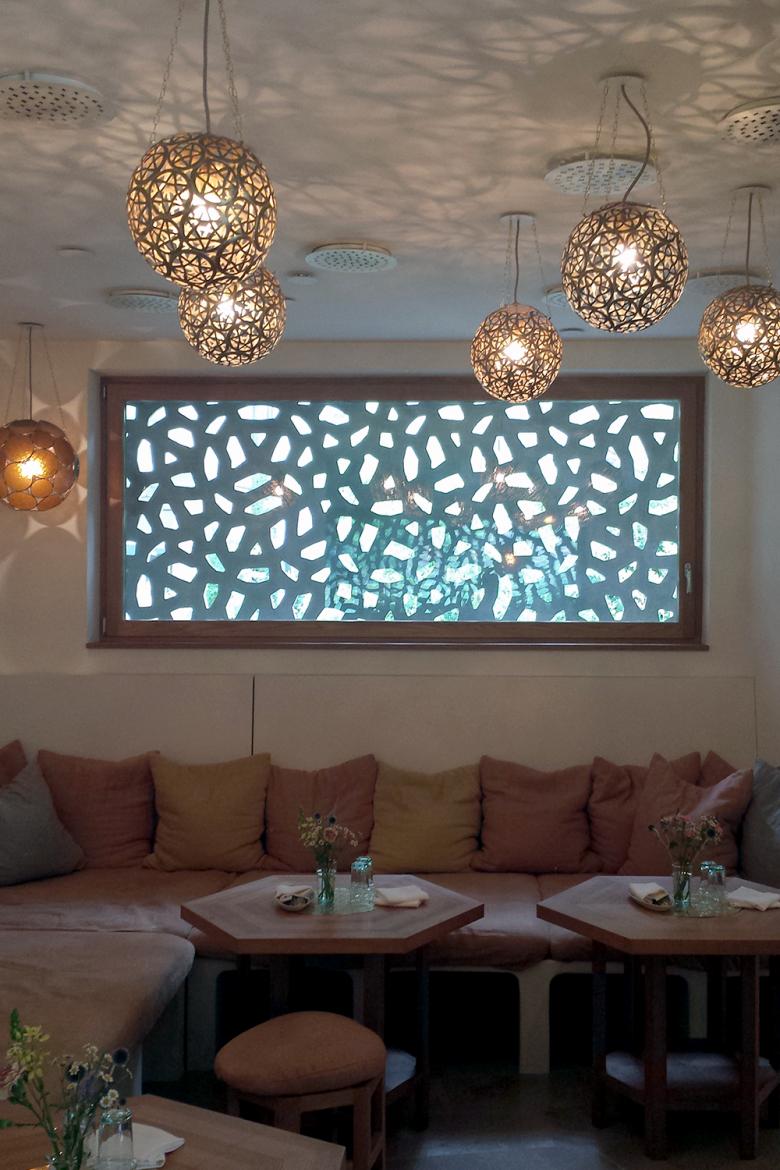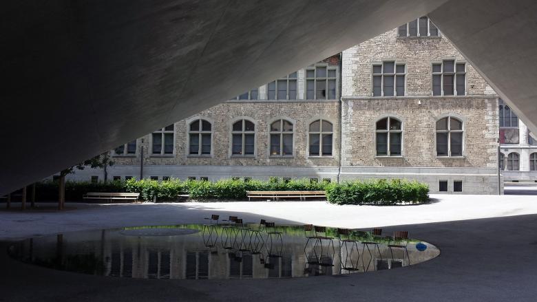 Just a few blocks east of the Heidi Weber Museum is Patumbah Park, which is anchored by the 19th century Villa Patumbah. In 2013 a restoration of the villa was completed, which coincided with the completion of two apartment buildings – parallel buildings on the eastern and western edges of the public park – designed by Miller & Maranta for Lis Mijnssen. The building on the west, on Mühlebachstrasse, also includes Hammam Basar, a modern spa modeled on Arab steam baths. This component adds a public aspect to the private residential development, including a cafe behind the moucharabieh, the traditional lattice windows reinterpreted by architects Quintus Miller and Paola Maranta.