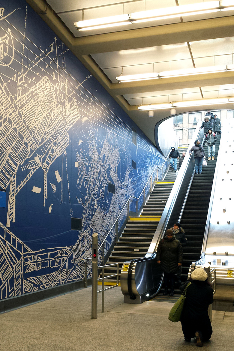 New York-based artist Sarah Sze's contribution is titled "Blueprint for a Landscape." Part of it covers a wall next to the escalators and stairs that connect the subway to the street.
