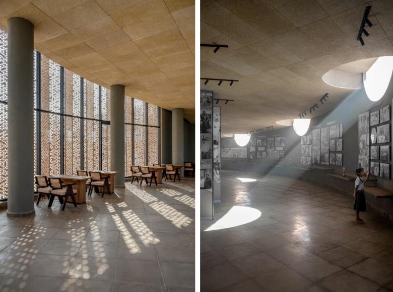 The Nokha Village Community Centre is surrounded by desert, so appropriately it is clad in locally sourced sandstone. Most striking is at the library, where sandstone screens filter the sunlight entering the ovoid space. The museum, housed in a long curving space beneath the ramping roof, is illuminated by light scoops set into the earth berm. The project is completed by two simple outbuildings with cafeteria, kitchen, restrooms, and other ancillary spaces. The whole project gives the community a place to gather and engage with each other and their natural surroundings.