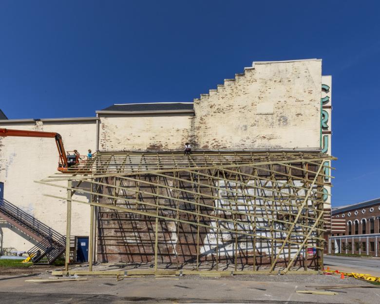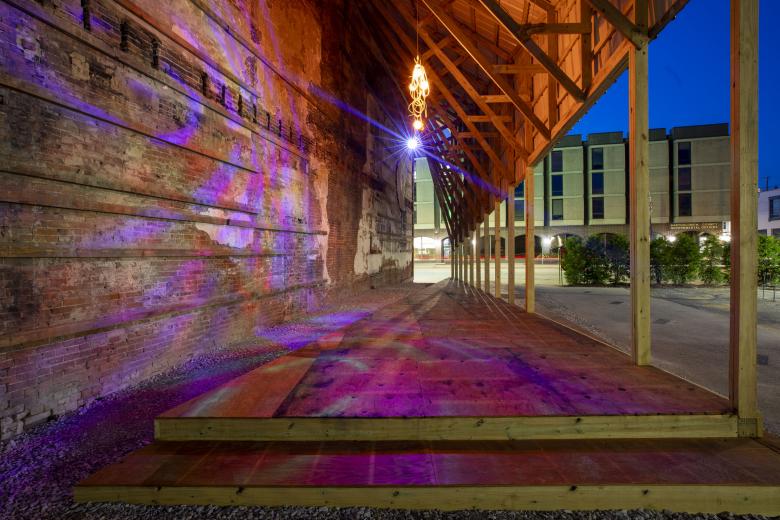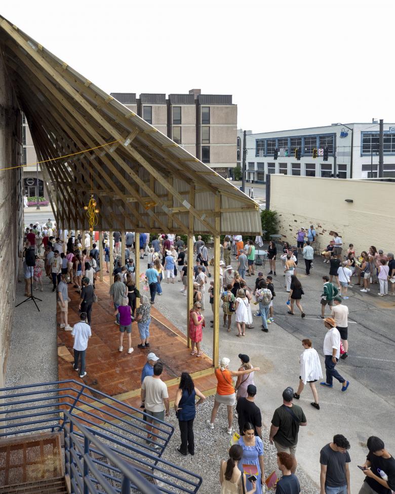 The empty lot east of The Crump arose from a fire in 1978. For this year's Exhibit Columbus, the space has been enlivened by Charlie Vinz and Adaptive Operations through a platform covered in metal siding. (Photo: Hadley Fruits for Landmarks Columbus Foundation)