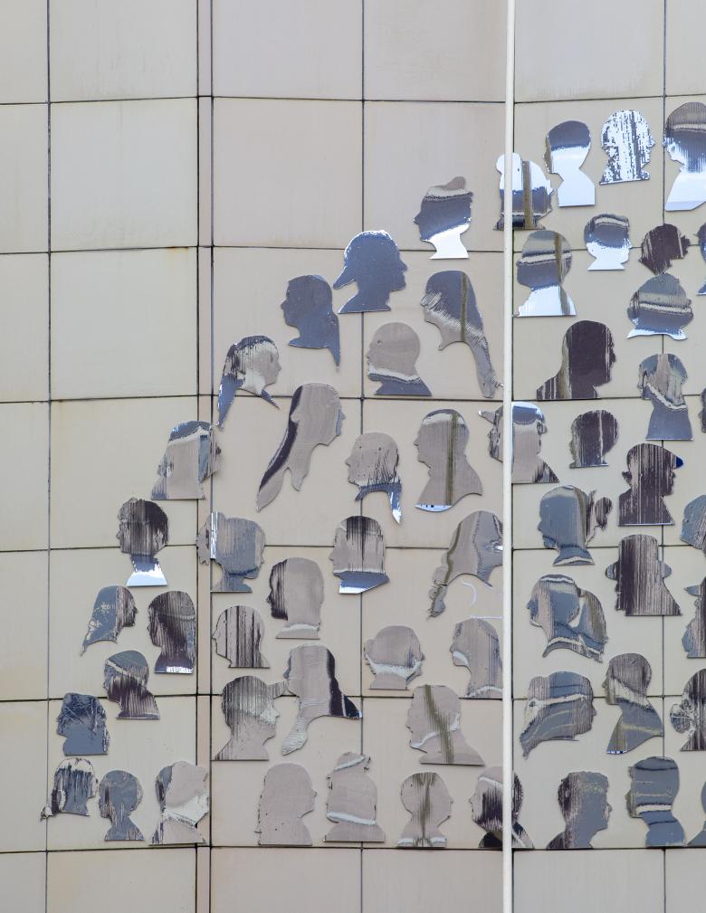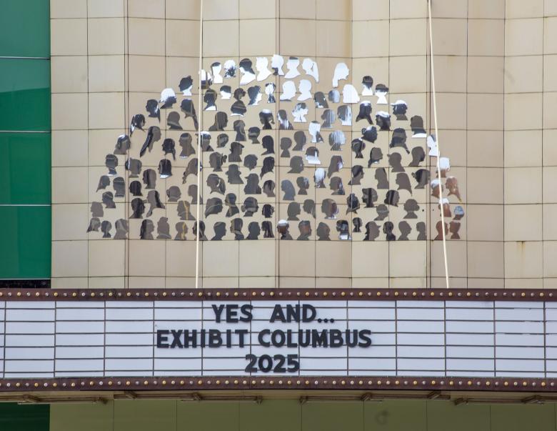 The arched “window” is comprised of portrait silhouettes made of mirrored vinyl on reused polycarbonate yard signs. (Photo: Hadley Fruits for Landmarks Columbus Foundation)