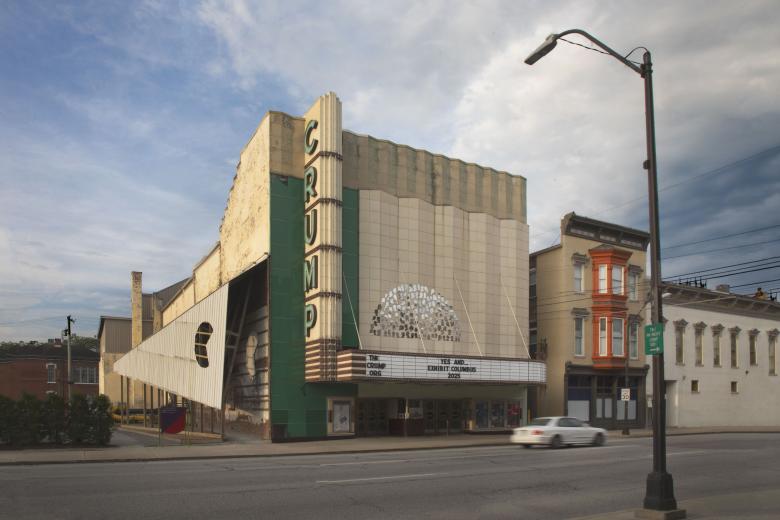 The Pac Man-like cutout in the siding is part of a rebrand, coinciding with the establishment of the nonprofit Crump Center for the Performing Arts, Inc. this year and the start of a larger transformation of the theater to its fully operational state. (Photo: Hadley Fruits for Landmarks Columbus Foundation)