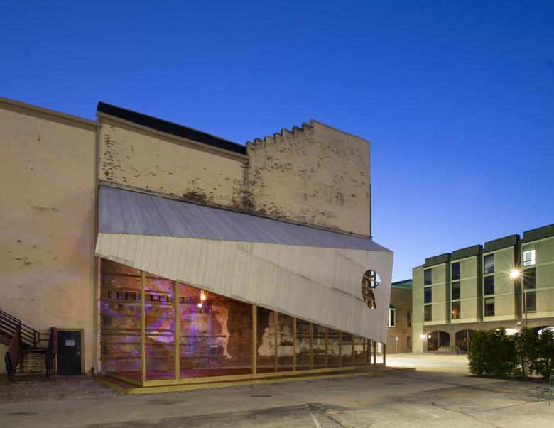 The phrase “yes, and” comes from improv theater and is defined by the Exhibit Columbus curators as “a technique for affirming and building upon an idea to create a shared narrative.” When applied to architecture, the phrase can signal an embrace of existing buildings and finding creative ways to extend their usefulness into the future. Such an approach is evident in Accessing Nostalgia, the multifaceted installation at the Crump Theatre designed by Adaptive Operations, the Chicago studio founded by Charlie Vinz in 2013 that focuses on “the adaptive reuse, renovation, and research of existing structures.” Accessing Nostalgia is one of four recipients of the J. Irwin and Xenia S. Miller Prize, named for the patrons who turned Columbus, Indiana into a destination for fans of modern architecture and design.