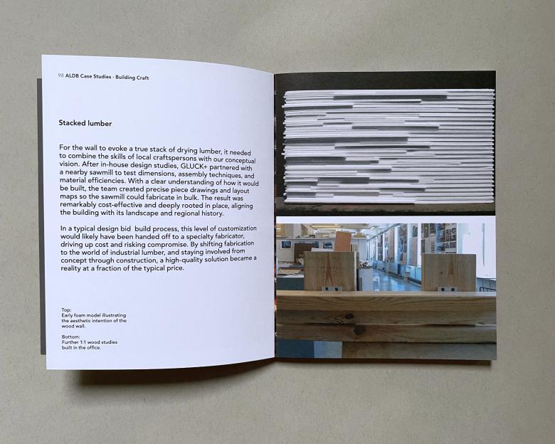 The second title in GLUCK+'s Booklets series devotes 178 pages to answering the title question. The book begins by distinguishing ALDB from the other delivery models that most architects work within, notably design bid build and contractor-led design build. The book touts GLUCK+'s own efforts but also serves as something of an invitation for other architects to consider ALDB, which they argue offer benefits of “deeper collaboration, a more responsive iterative design process, and ultimately both shorter project duration and lower cost.” That is the first half of the book, with the second half devoted to a half-dozen case studies. One of them is the Blue Ridge House in North Carolina, a large house organized about a wood wall detailed to look like the stacks of drying timber found at the area's lumber mills (below spread). The case study focuses on how ADLB enabled the final outcome, while the other case studies in the book illustrate how ADLB impacts other parts of the design and building process.