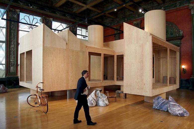 At the other end of the same fourth-floor gallery as Tatiano Bilbao's contribtuion is MOS Architects' House No. 11. Also called the Corridor House, the New York architects call it a melding of "the strange figures of suburban corridors along with the openness of a Miesian courtyard house." Constructed out of plywood in modules no wider than a corridor (and therefore able to be shipped on trucks), the house looks like it could be rearranged easily depending upon site conditions and other factors.