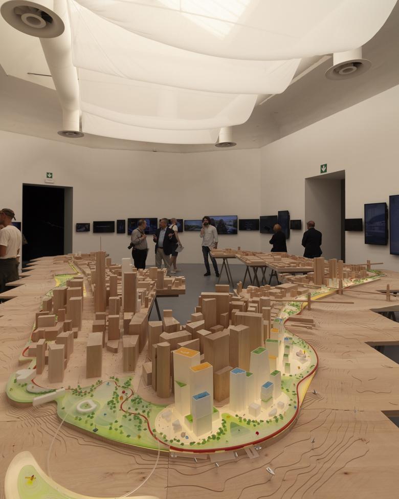 BIG - Bjarke Ingels Group softened the light coming into the gallery occupied by their model of Manhattan shoreline in the year 2050.